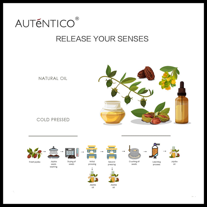 AUTéNTICO Jojoba Seed Oil is extracted by cold pressed of Jojoba Seed, and packed with vitamins and minerals, not only beneficial for skin but also is beneficial in combating multiple hair concerns and protecting the health of your hair.